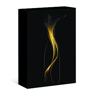 Geschenkverpackung mit natürlicher Haptik und goldener 3D-Heißfolienprägung, innen schwarz eingefärbt, mit schwarzer Einlage, postversandfähig mit passendem Umkarton