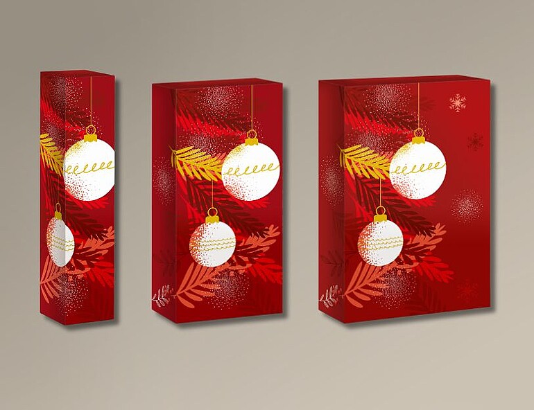 Die Faltschachtel in kräftigem Rot überzeugt mit modernem Design und grafischen Elementen – perfekt für stilvolle Weihnachtsgeschenke mit hochwertiger Anmutung. Erhältlich als 1er-, 2er- und 3er-Weingeschenkkarton, stabil, edel und sofort einsatzbereit.
