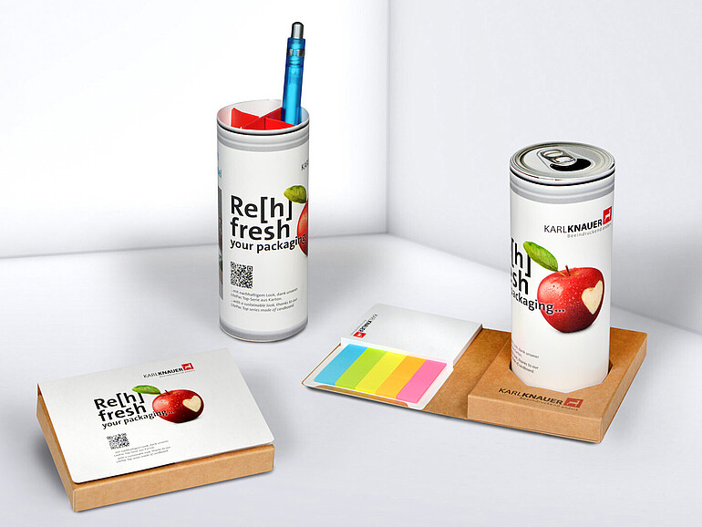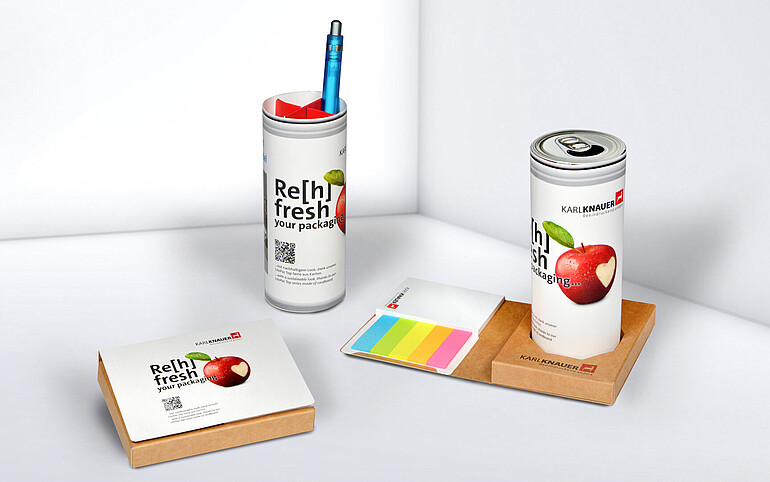 Die täuschend echte Optik macht das hochwertige Büro-Utensil zu einem originellen Hingucker – gefertigt aus nachhaltigem Kartonmaterial. Unter dem Deckel der „Dose“ verbirgt sich ein praktischer Stifteköcher, in dem Kugelschreiber, Scheren und Co. bequem Platz finden. Zusätzlichen Mehrwert bietet das im Set enthaltene Zubehör: ein Ständer für die Dose, der zugleich aus farbenfrohen Markern – wahlweise aus individuell gestaltbarem Papier oder klassischen Markerset in Neonfarben – sowie einem Block mit praktischen Haftnotizen besteht. Wie alle Werbemittel von Karl Knauer lässt sich auch dieser smarte Organizer individuell gestalten. Ob mit einem kreativen Kampagnen-Motiv, einer Grußbotschaft zu einem besonderen Anlass oder im Corporate Design des Unternehmens – bereits ab einer Auflage von 500 Stück ist nahezu alles möglich.